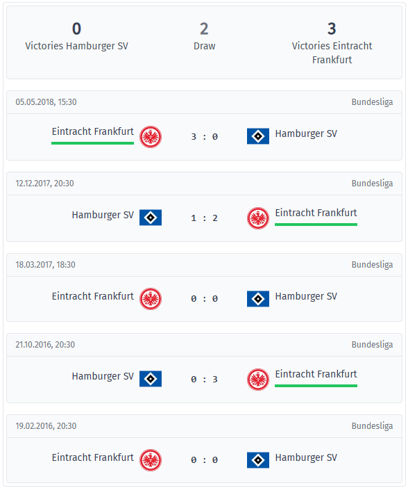 Είναι ενδιαφέρον ότι η Φρανκφούρτη έχει σαφώς υπερισχύσει στις τελευταίες πέντε αναμετρήσεις μεταξύ του Αμβούργου και της Αϊντραχτ Φρανκφούρτης, που διεξήχθησαν μεταξύ 2016 και 2018, με τρεις νίκες και δύο ισοπαλίες. Αυτό σημαίνει ότι είναι αήττητη σε πέντε παιχνίδια σε αυτό το ντέρμπι, ενώ η Αμβούργου δεν έχει κερδίσει σε αυτό το διάστημα. Το συνολικό σκορ είναι 8-1 υπέρ της Φρανκφούρτης, γεγονός που υπογραμμίζει πόσο μονόπλευρα ήταν τα αποτελέσματα στον πίνακα αποτελεσμάτων. Χρονολογικά, μια ισοπαλία χωρίς γκολ το 2016 άνοιξε αυτή τη σειρά, πριν η Φρανκφούρτη προσθέσει μια εκτός έδρας νίκη με 3-0 την ίδια χρονιά. Ακολούθησε ένα άλλο 0-0 το 2017, πριν η Eintracht κερδίσει με 2-1 στο Αμβούργο και ολοκληρώσει το 2018 με μια εντός έδρας νίκη με 3-0. Σε αυτό το διάστημα, ο HSV σκόραρε μόνο μία φορά και παρέμεινε χωρίς γκολ σε τέσσερα παιχνίδια. Στατιστικά, αυτά τα παιχνίδια ήταν μάλλον ισορροπημένα, παρά τις σαφείς διαφορές στο συνολικό σκορ. Κάθε παιχνίδι έμεινε κάτω από τέσσερα γκολ και σε τέσσερα από τα πέντε παιχνίδια σημειώθηκε το πολύ ένα γκολ στο πρώτο ημίχρονο. Το Αμβούργο δεν σημείωσε ούτε ένα γκολ στο δεύτερο ημίχρονο σε αυτή τη σειρά, ενώ η Φρανκφούρτη δεν δέχτηκε γκολ μετά την αλλαγή των ημιχρόνων, οπότε οι τελευταίες φάσεις τείνουν να ανήκουν στην ομάδα της Έσσης. Και οι πέντε αναμετρήσεις πραγματοποιήθηκαν στο πρωτάθλημα μεταξύ 2016 και 2018, οπότε το δείγμα είναι σαφώς οριοθετημένο, αλλά ιστορικά ήδη κάπως απομακρυσμένο. Η Φρανκφούρτη μπορεί ωστόσο να αντλήσει κάποια αυτοπεποίθηση από το αήττητο ρεκόρ και τα επαναλαμβανόμενα παιχνίδια χωρίς γκολ, ενώ για την HSV η ανάμνηση ενός μόνο γκολ σε πέντε παιχνίδια εναντίον αυτού του αντιπάλου παραμένει μάλλον στο παρασκήνιο, αντί να χρησιμεύει ως άμεσος προγνωστικός παράγοντας.