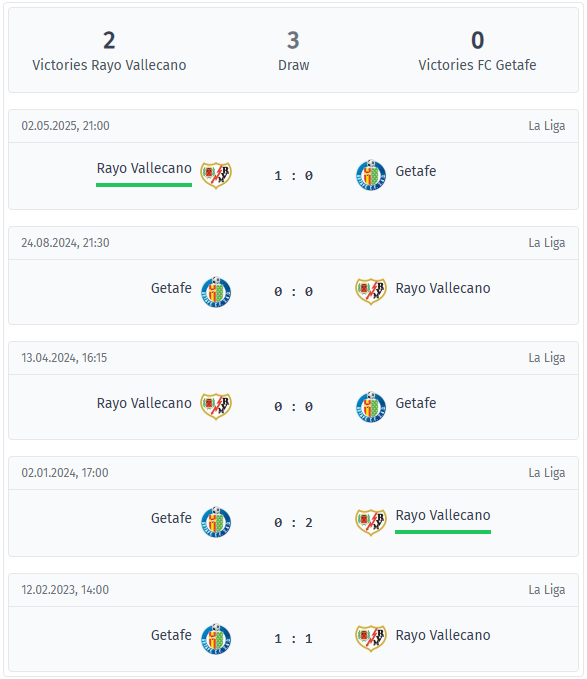 Οι προβλέψεις ακολουθούν μια σαφή γραμμή: νίκη της Rayo, «Και οι δύο ομάδες θα σκοράρουν: Όχι» και ισοπαλία στο ημίχρονο. Η αγορά στοιχημάτων θεωρεί τους γηπεδούχους φαβορί με απόδοση 2,1, κάτι που φαίνεται σχεδόν γενναιόδωρο, δεδομένου ότι η Getafe στερείται του Mayoral και έχει μια σειρά από ήττες χωρίς να έχει σκοράρει.