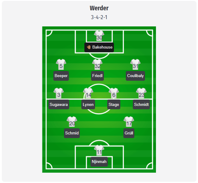 Ο Steffen θα διατηρήσει πιθανότατα το 3-4-2-1, με τον Backhaus να βρίσκεται πίσω από την τριάδα Pieper, Friedl και Coulibaly στην αρχική ενδεκάδα. Λόγω των απουσιών των Weiser και Agu, οι θέσεις των wingback θα πάνε πιθανότατα στον Sugawara στα δεξιά και στον Schmidt στα αριστερά, γεγονός που αυξάνει ακόμη περισσότερο τη σημασία του συγχρονισμού και της αμυντικής πειθαρχίας στα πλάγια. Στο κέντρο, οι Lynen και Stage είναι το πιθανό δίδυμο στο διπλό εξάρι, με αποστολή να ασφαλίζουν το κέντρο και να επιταχύνουν την πρώτη πάσα της Βέρντερ προς τα εμπρός. Οι Schmid και Grüll φαίνονται ως οι πιο προφανείς δύο δημιουργοί πίσω από τον Njinmah, ενώ ο Milosevic είναι μια σαφής εναλλακτική λύση, ειδικά καθώς ο Boniface θα λείψει για το υπόλοιπο της σεζόν. Στην άμυνα λείπουν επίσης οι Stark και Wöber, γεγονός που μειώνει το δυναμικό της ομάδας.