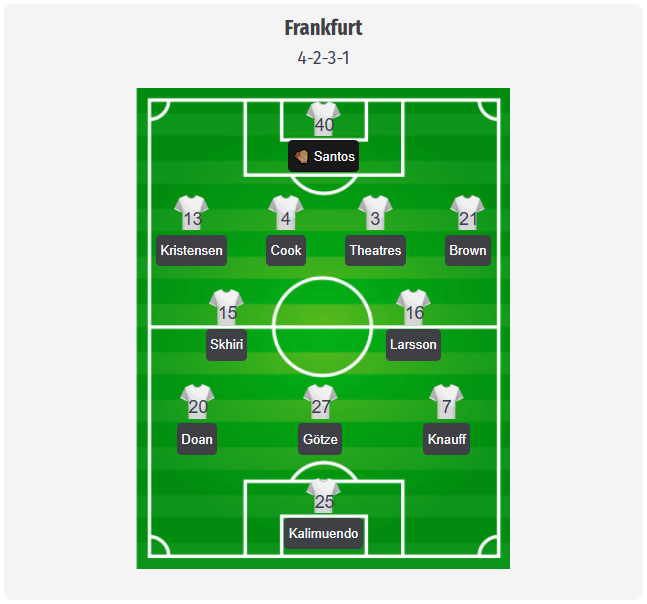 Ο Toppmöller αναμένεται να διατηρήσει το γνωστό 4-2-3-1, με τον Santos να είναι και πάλι ο βασικός τερματοφύλακας. Η πιθανή τετράδα της άμυνας θα αποτελείται από τους Kristensen, Koch, Theate και Brown, μια ομάδα που πιθανότατα θα αμυνθεί λίγο πιο βαθιά, για να είναι πιο ασφαλής στις φάσεις της μετάβασης. Στο κέντρο, οι Skhiri και Larsson θα είναι πιθανότατα οι δύο μέσοι, με τον Götze στο κέντρο, ενώ οι Doan και Knauff θα δίνουν πλάτος πίσω από τον Kalimuendo. Δεδομένου ότι ο Ουζούν εξακολουθεί να απουσιάζει, η δημιουργικότητα της Φρανκφούρτης μεταξύ των γραμμών θα εξαρτηθεί και πάλι σε μεγάλο βαθμό από τον Γκέτσε, ενώ ταυτόχρονα οι απουσίες των Μπουρκάρντ και Μπατσουάι περιορίζουν τις επιλογές για έναν κλασικό εννιάρι. Αυτός είναι ακριβώς ο λόγος για τον οποίο ο Καλιμούεντο είναι μια προφανής πρόβλεψη ως επιθετικός. Η απουσία των Μπαουμ και Τσάντλερ περιορίζει επίσης την εναλλαγή στις θέσεις των εξωτερικών αμυντικών, οπότε ο Μπράουν θα πρέπει πιθανώς να κατανείμει καλύτερα τις κούρσες του. Αν χρειαστούν προσαρμογές, ο Chaïbi ή ο Dahoud από τον πάγκο θα μπορούσαν να αλλάξουν τον ρυθμό.