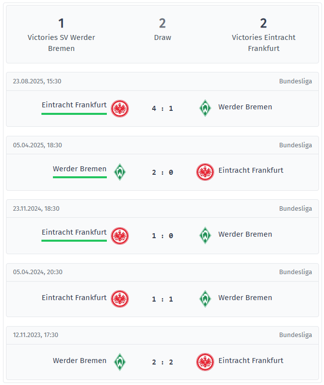 Werder – Φρανκφούρτη Άμεση σύγκριση & στατιστικά