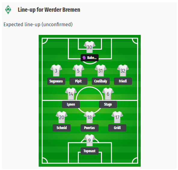 Ο προπονητής Horst Steffen αναμένεται να παρατάξει το συνηθισμένο σύστημα 4-2-3-1, αλλά πρέπει να αντιμετωπίσει σημαντικές απώλειες στην άμυνα. Με τους Weiser, Wöber, Stark, Deman, Agu και Schmidt, έξι αμυντικοί είναι επί του παρόντος εκτός δράσης. Ο Stark επέστρεψε στις προπονήσεις της ομάδας, αλλά είναι ακόμα νωρίς για να αγωνιστεί στον αγώνα της Παρασκευής. Ο αρχηγός Friedl θα μπορούσε να είναι ξανά διαθέσιμος μετά την προπόνησή του σε κλειστό γήπεδο και έχει πιθανότητες να πάρει θέση στην αρχική ενδεκάδα. Στο αμυντικό κέντρο, οι Lynen και Stage αναμένεται να οργανώσουν το κέντρο. Στην επίθεση, οι Schmid, Puertas και Grüll θα πρέπει να δώσουν δημιουργικότητα πίσω από τον επιθετικό Topp. Ο Victor Boniface θα ξεκινήσει πιθανότατα και πάλι στον πάγκο, η αποκατάστασή του προχωράει, αλλά σύμφωνα με τον Steffen δεν αναμένεται να ξεκινήσει στην αρχική ενδεκάδα. Ο Amos Pieper έχει προτεθεί για περαιτέρω συμμετοχές χάρη στην ισχυρή του απόδοση στο Heidenheim και θα μπορούσε να ξεκινήσει δίπλα στον Coulibaly στην κεντρική άμυνα.