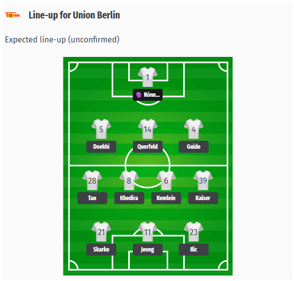 Ο προπονητής Steffen Baumgart σχεδιάζει ένα 3-4-2-1 με τους Doekhi, Querfeld και Leite στην τριάδα της άμυνας, ενώ οι Trimmel και Köhn θα καλύψουν τις εξωτερικές θέσεις. Ο αρχηγός Trimmel είναι και πάλι σε φόρμα μετά το διάλειμμα και φέρνει εμπειρία, ενώ στο κεντρικό μέσο θα παίξουν οι Khedira και Kemlein. Ο Markgraf και ο Skov εξακολουθούν να απουσιάζουν από την προπόνηση, ο Schäfer έχει ολοκληρώσει την πλήρη εβδομάδα προπόνησης και είναι μια επιλογή για τον πάγκο. Στην επίθεση, ο Ilic προορίζεται για κεντρική κορυφή, ενώ ο Jeong και ο Skarke θα πρέπει να φέρουν δημιουργικότητα πίσω από αυτόν. Τακτικά, ο Baumgart απαιτεί περισσότερη σαφήνεια στην επίθεση αντί για καθαρή κατοχή της μπάλας. Η Union οδηγεί το πρωτάθλημα με 101 φάουλ, αλλά κερδίζει μόνο το 49,6% των διπλών της.