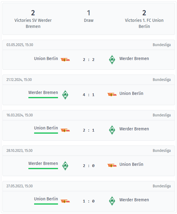 Werder – 1. FC Union Berlin Άμεση σύγκριση & στατιστικά
