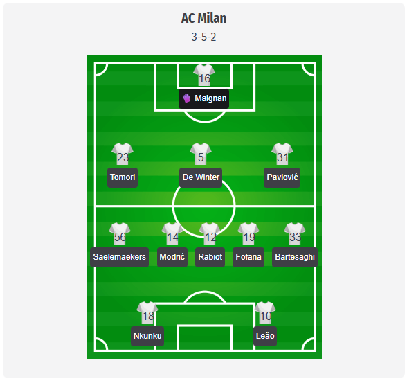 AC Milan are expected to stick with their now familiar 3-5-2 formation, as predicted here, with Maignan in goal behind a back three of Tomori, Pavlović, and De Winter. Saelemaekers and Bartesaghi should occupy the wings, while Modrić, Rabiot, and Fofana form a technically strong but combative midfield. Up front, Nkunku and Leão are likely to operate as a flexible duo, often dropping into a 3-4-2-1 formation when in possession. Allegri may tweak individual roles, but the core of this expected starting lineup looks set, especially as Gabbia remains sidelined in defense and Gimenez is unavailable as a classic penalty area striker. Their absence underlines Tomori’s central importance in defense and means that AC Milan will be more mobile and versatile up front, with Pulisic and Loftus-Cheek likely to be used as effective options from the bench rather than starters.