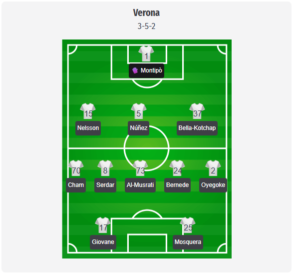 Under Zanetti, Verona is likely to play a 3-5-2 system again, so this is clearly a prediction and not an official confirmation. In our expected lineup, Montipò starts in goal, backed up by a back three of Nelsson, Núñez, and Bella Kotchap, while Cham and Oyegoke take on the wide roles to compensate for the absence of the suspended Frese and the injured Bradarić on the wings. In midfield, we continue to expect Serdar to start alongside Al-Musrati and Bernede, a trio that gives Verona both ball control and reliable protection in front of the defense. With Suslov out long term and Belghali away with Algeria, squad depth is reduced, and up front we see Giovane and Mosquera as the predicted strike partnership, with Orban remaining a very real alternative.
