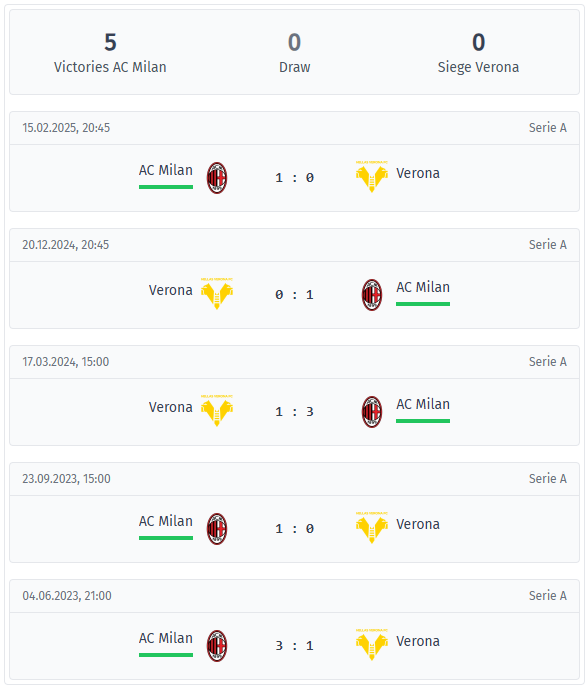 In the last five Serie A encounters, AC Milan has won every single game, with five wins from five games and not a single draw. The most recent match in February 2025 ended 1-0 for Milan at San Siro, another example of Verona usually trailing behind on this stage and rarely posing a serious threat to completely turn the game around. The goal difference underscores this control, with Milan scoring in all five games, nine goals in total, while Verona found the net only twice, both times in 3-1 defeats. Three of the five encounters were decided by just one goal, suggesting that the duel remains competitive at times, even if the points consistently end up with Milan. The rhythm of these games has been remarkably consistent, with all five first halves ending with under 1.5 total goals, and Milan coming into this matchup on the back of three consecutive halftime leads. Verona has never led at the break in this sample and has failed to score before halftime, suggesting that Milan takes control early without immediately opening up the games. As the game progresses, the trend becomes even clearer, with Milan winning the second half in four of the last five encounters and Verona conceding goals after the break in four of those games. Overall, this five-game block paints a tough picture from Verona’s perspective, with five consecutive defeats and no draws to even slightly slow down Milan’s authority in direct comparison. At the same time, the repeated 1-0 victories suggest that Verona can often keep the gaps narrow, while psychological baggage has probably long played a role, as Milan goes into this direct duel with a whole host of positive memories.
