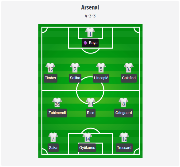 Arsenal are likely to stick with the 4-3-3 formation we predicted, based on the Everton win, with Raya, Timber, Saliba, Hincapié, and Calafiori in the back four, Zubimendi, Rice, and Ødegaard in midfield, and Saka, Gyökeres, and Trossard in attack.