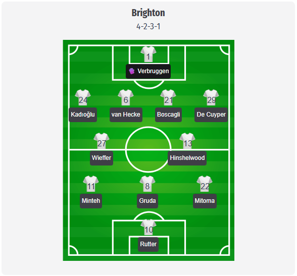 Further forward in our model is a trio of Minteh on the right, Gruda in the center, and Mitoma on the left behind Rutter, giving Brighton pace on the wings despite the continued absence of March. With Tzimas out with a cruciate ligament rupture and Gomez suspended, Welbeck, after his return from back problems, appears in our predicted lineup as a substitute rather than in the starting eleven.