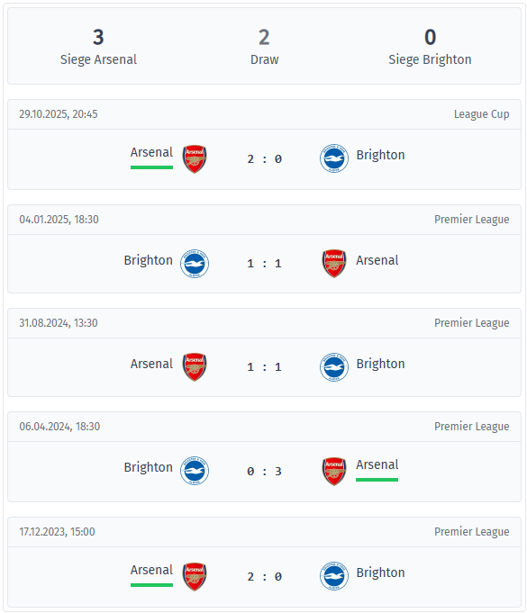 The pattern of goals is striking. All five games ended with at least two but never more than three goals, and four of them remained under 2.5 goals. Arsenal scored in every game and Brighton conceded goals. The first halves were remarkably cautious and always remained goalless, so the duels only developed later when fatigue set in and spaces opened up.