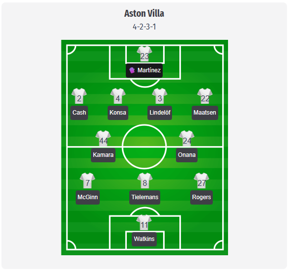 Aston Villa will in all likelihood line up in their usual 4-2-3-1 formation. In the predicted starting lineup, Martínez returns in goal, with Cash, Konsa, Lindelöf, and Maatsen forming the back four in front of him. Kamara and Onana take over the double six, with McGinn and Rogers playing alongside Tielemans as central creative posts behind Watkins, keeping Villa compact without the ball and allowing Rogers and McGinn to repeatedly run into the half-spaces. At the back, the managers are planning without Mings, who is still out with thigh problems, and Pau Torres is being brought back gently after his injury, meaning that the duo of Konsa and Lindelöf are likely to remain together in central defense. Guessand is away with his national team and Sancho is ineligible to play against United, so Buendía and Malen are the most likely options to come off the bench in this scenario. All of this remains a projection and is subject to change, but the system would once again see Kamara and Onana providing cover for a center-back pairing that is still finding its feet, with Tielemans able to pop up flexibly between the lines, Watkins pressing aggressively from the front, and Rogers, in his recent form, acting as an important link between midfield and attack.