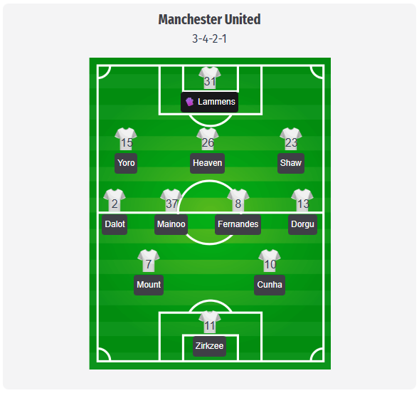 Manchester United are expected to return to Rúben Amorim’s familiar 3-4-2-1 formation. In the predicted starting lineup, Lammens is in goal behind a back three of Yoro, Heaven, and Shaw, while Dalot and Dorgu provide width and depth on the wings. Mainoo and Fernandes are likely to start in central midfield, with Mount and Cunha supporting the expected center forward Zirkzee, who, based on the signals so far, should once again lead the line. This lineup is largely a result of injuries, with De Ligt and Maguire still out, which is why Yoro and Heaven seem to be the obvious choice as the center-back duo. In addition, Mazraoui is at the AFCON. Casemiro’s suspension suggests that Mainoo will start in midfield, and with Mbeumo and Amad also at the AFCON, Fernandes and the duo of Mount and Cunha will carry even more creative responsibility, although Amorim may make a late tactical adjustment.