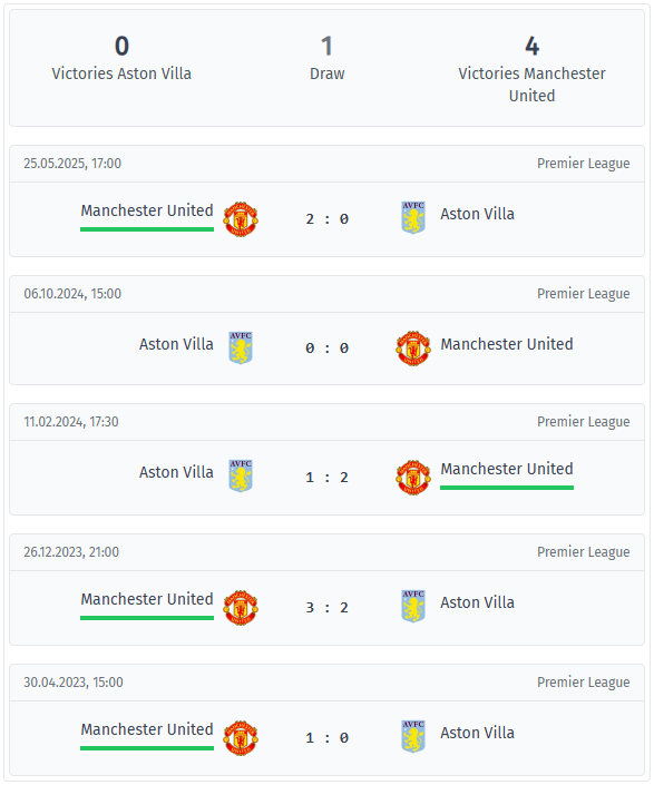 In a direct comparison of the last five league matches from 2023 to May 2025, Manchester United has clearly had the upper hand, with four wins and one draw, while Aston Villa has been unsuccessful, clearly underlining the visitors’ advantage. In terms of numbers, this means that United has won 80% of these games and the duel in recent league history has been clearly one-sided. Home advantage has hardly shifted the balance of power so far, with the two most recent league games at Villa Park ending 0-0 in 2024 and 2-1 to United, also in 2024, meaning Villa have taken just one point at home in this series, while United have remained flawless at Old Trafford with 1-0 and 3-2 wins in 2023 and a 2-0 win in May 2025. In terms of content, these encounters were more close than spectacular, with four of the five games remaining under 3.5 goals and 80% of them seeing under 1.5 goals in the first half. United scored in four of the five duels, while Villa failed to score in two of their last three games during this period, highlighting the greater firepower of the visitors in this pairing. United were particularly dominant in 2023 and 2024, when the team won three league games in a row against Villa, each time scoring goals and ultimately defeating their opponents. It is precisely this streak, combined with an overall win rate of 80%, that points to a psychological advantage, while Aston Villa continues to search for a way to finally break this pattern.