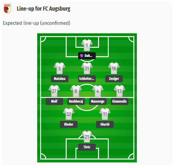Augsburg is expected to start in a 3-4-2-1 formation. Dahmen will be in goal, with Matsima, Schlotterbeck, and Zesiger forming the back three in front of him. Captain Gouweleeuw is out with knee problems, which leaves a hole in the defense. Wolf and Giannoulis are expected to play on the wings, with Rexhbecaj and Massengo stabilizing the central midfield. In attack, Gharbi and Rieder could play behind striker Tietz to create danger on the wings. The lineup is a prediction; the final formation will only be decided shortly before kickoff.