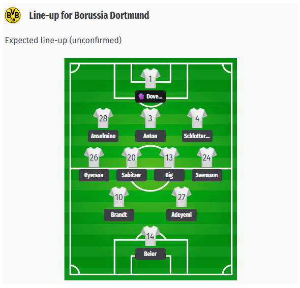 Niko Kovač is likely to start with a back three: Anselmino, Anton, and Schlotterbeck in central defense; Gregor Kobel, who showed nerves of steel in the penalty shootout against Frankfurt, is set to start in goal. Pascal Groß and Marcel Sabitzer are expected to play in defensive midfield, with Ryerson on the right and Svensson on the left. The starting lineup in attack is still open: Guirassy is injured, which is why Silva or Beier are possible options as a deep-lying striker/central attacker, flanked by Julian Brandt and Karim Adeyemi. Emre Can is out with adductor problems, while Bensebaini and Duranville are also injured. Despite these absences, Dortmund have enough quality to field their planned formation.