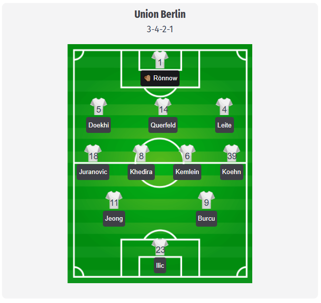 Baumgart is likely to stick with Union’s familiar 3-4-2-1 formation, with Rönnow in goal and a back three of Doekhi, Querfeld, and Leite. Juranovic and Köhn seem the most likely full-backs, with Khedira starting alongside Kemlein in central midfield. In front of them, Jeong and Burcu could operate as creative players behind Ilic, who provides the focal point as the target man. According to the list, Rothe is unavailable due to injury, so the left side is likely to rely once again on Köhn’s runs and Leite’s cover rather than a more natural option as a left-sided player. Skov’s absence also suggests that Jeong will remain high between the lines, while the absences of Skarke and Bogdanov could somewhat diminish the late speed coming off the bench. Querfeld remains a key figure, including on penalties.