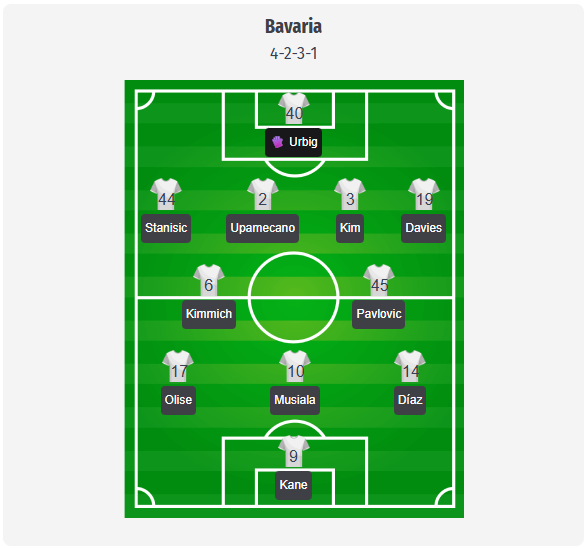 Kompany is likely to stick with his usual 4-2-3-1 formation, with Urbig scheduled to start in goal. In this prediction, the back four consists of Stanisic, Upamecano, Kim, and Davies, with the plan to play high up the pitch and push the ball quickly into midfield. Kimmich and Pavlovic are the most likely duo in the double six, with Musiala behind them distributing the ball to Kane between the lines. With Neuer currently out with gastroenteritis, Urbig is the most obvious option, with Ulreich the clear alternative. Guerreiro’s calf strain pushes Davies further towards the left side as a starter, with Ito a possible adjustment if Bayern want a little more stability in their build-up play. Ndiaye is still ineligible to play in the UEFA Champions League, so the rotation in midfield is likely to rely mainly on Kimmich, Pavlovic, and Goretzka.