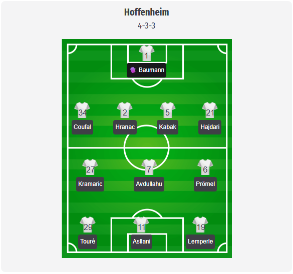 Baumann should start in goal, behind Coufal, Hranac, Kabak, and Hajdari, and Hoffenheim will likely maintain the aggressive forward defending and early counter-pressing that has characterized their best phases this season. In midfield, Kramaric is seen as an important link player alongside Avdullahu and Prömel, allowing the front line to quickly get involved in transition moments. Up front, Touré, Asllani, and Lemperle are the expected trio, partly because Hlozek is out and Campbell is also unavailable. Machida and Frees are still missing at the back, so the center-back pairing looks set.