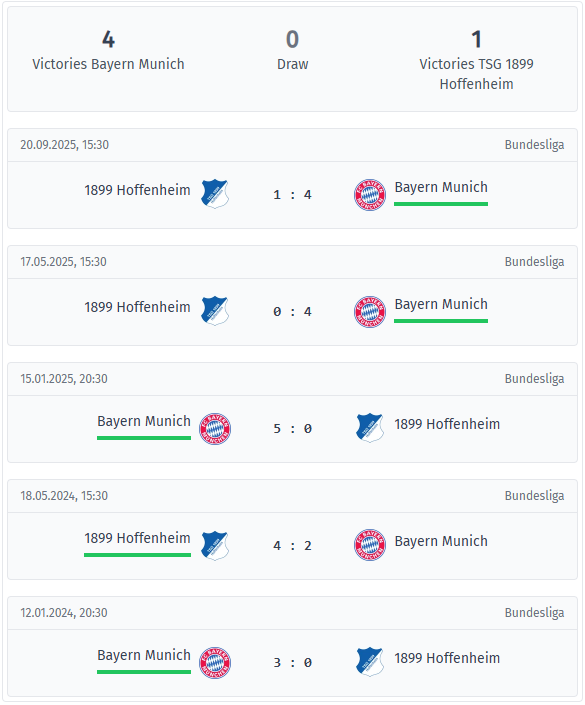 The results of the last five encounters have been fairly one-sided: Bayern won four times, Hoffenheim once, and there were no draws. In September 2025, Bayern won 4-1 in Sinsheim, having previously won 4-0 away and 5-0 in Munich in 2025. Hoffenheim’s only success in this series was a 4-2 home win in 2024, with Bayern also winning 3-0 at home in 2024. There is a clear pattern in this sequence: Bayern have won the last three encounters, each time by at least three goals. It’s not just about the final score, because Bayern have led at half-time in each of the last five meetings, which has repeatedly forced Hoffenheim into risky chasing. Another recurring theme is the number of goals scored, with every game exceeding the 2.5-goal mark, a useful historical indication of an open game if Hoffenheim can do its part.