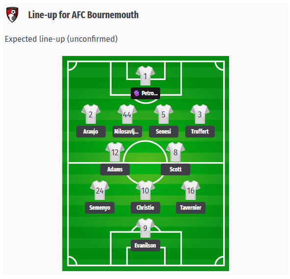 If Semenyo is fit, Andoni Iraola is likely to field Evanilson as center forward in front of an attacking trio of Semenyo, Christie, and Tavernier, with Adams and Scott expected to play in defensive midfield. Araujo, Milosavljevic, Senesi, and Truffert are predicted to form the back four. If Semenyo is unavailable, Brooks or Adli are likely to come into the team as alternatives.