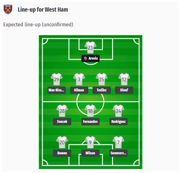 Bowen, Wilson, and Summerville are expected to provide the attacking threat. The expected back four consists of Wan-Bissaka, Kilman, Todibo, and Diouf.