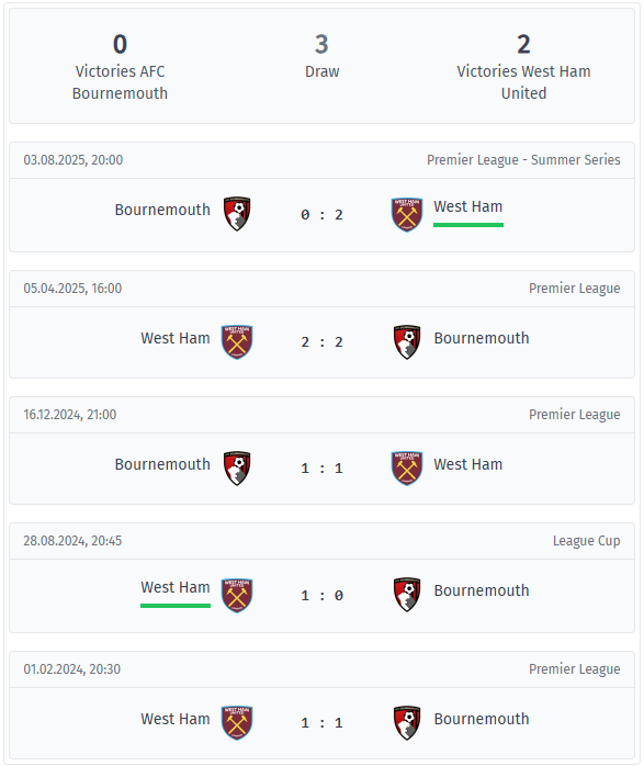 In the last five direct duels between Bournemouth and West Ham, Bournemouth failed to win, West Ham won two of these games, and three encounters ended in a draw. West Ham scored at least once in all five games, while Bournemouth conceded at least one goal in each of these duels.