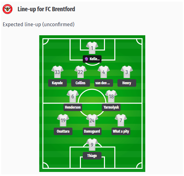 Henderson and Yarmolyuk are expected to provide cover in defensive midfield, while Ouattara, Damsgaard, and Schade will provide impetus in the attacking triangle, with Thiago leading the line.