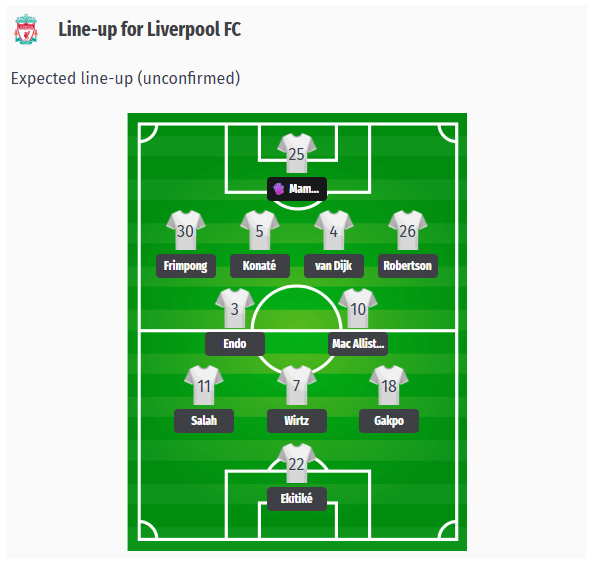 Liverpool are expected to line up in a 4-2-3-1 formation; Alisson is still out with a thigh injury, so Mamardashvili is expected to start in goal.