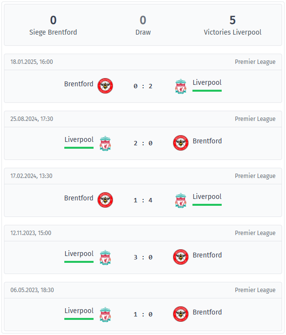 The head-to-head record between Brentford and Liverpool is clear: Liverpool have won all of the last five meetings, with Brentford failing to pick up a point in that series.