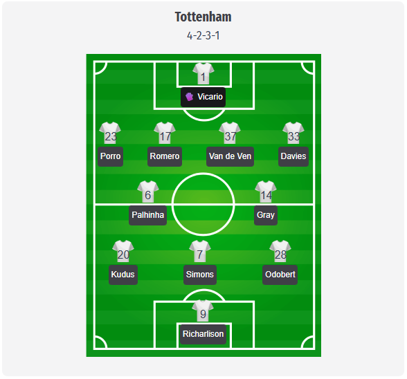 Tottenham are expected to stick with Thomas Frank’s now familiar 4-2-3-1 at Brentford, in our predicted line-up built around Vicario behind a back four of Porro, Romero, Van de Ven, and Davies. Romero returns from suspension to complement Van de Ven, while Davies is expected to continue on the left in Udogie’s absence, which should give this flank a little more security against Brentford’s counter-attacking play. In midfield, we see Palhinha and Gray as a double six, with Palhinha providing cover and Gray given the freedom to break lines after his winning goal against Palace. Ahead of them, we expect Kudus, Simons, and Odobert to support center forward Richarlison, who is currently Spurs’ leading scorer in the league. Key absences mark this possible starting eleven, with Bissouma and Sarr away on international duty, and Maddison, Kulusevski, Solanke, and Udogie still unavailable due to injury.