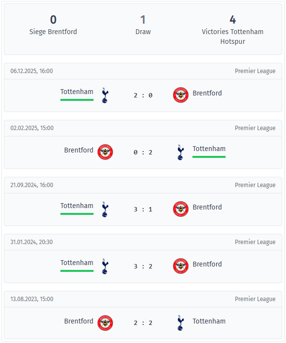 Brentford – Tottenham Head-to-Head & Statistics