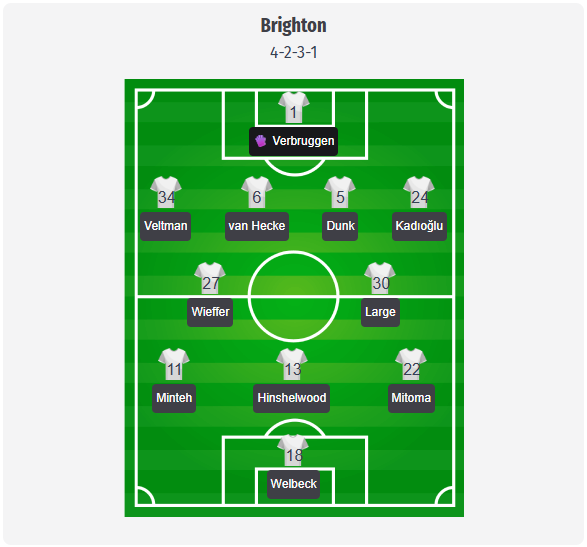Fabian Hürzeler is likely to stick with his usual 4-2-3-1 formation, with Verbruggen behind a back four of Veltman, van Hecke, Dunk, and Kadıoğlu. The double six with Wieffer and Groß seems to work best when it comes to control and second balls, allowing Brighton to build up through the center and still find the wings early on once the pressing is overcome. Further up front, Minteh and Mitoma should provide direct width, with Hinshelwood acting as the link player behind Welbeck, who has been in really good form in front of goal recently. Webster is out long term, so depth in central defense is thin, and Tzimas is also unavailable. Ayari has returned to training and could be an option on the bench if he gets the green light in time.