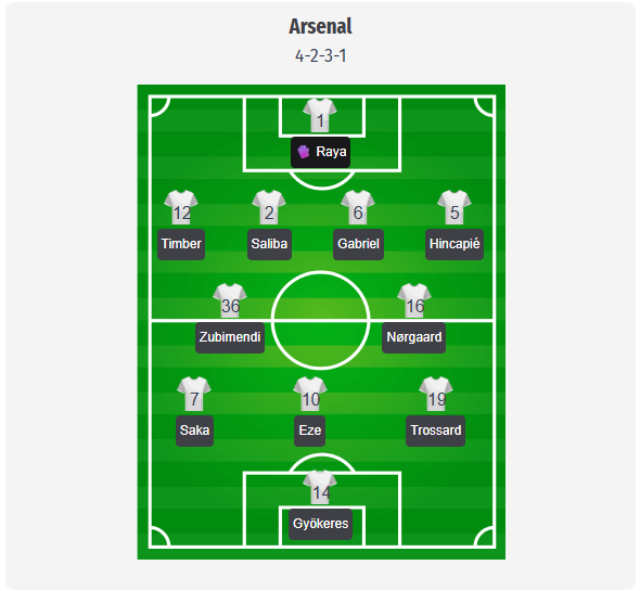 Mikel Arteta is likely to stick with a 4-2-3-1, with Raya behind Timber, Saliba, Gabriel, and Hincapié. In this prediction, Zubimendi and Nørgaard form the double six to keep the build-up clean and secure transitions, allowing Eze to operate between the lines. Saka will serve as an outlet on the right, Trossard will move in from the left, and Gyökeres will lead the line as the clear target player. The catch is fitness in midfield. Rice is still being assessed after his limping exit against Chelsea, and Ødegaard’s knee problem has kept him out recently, so one of the two could force a change at short notice, perhaps with Rice alongside Zubimendi and Ødegaard in the number ten role. Merino remains out after foot surgery, and Dowman is still missing with ankle problems. White could return after his knock to stabilize the defense.
