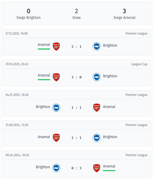 The last five head-to-head matches have tended to favor Arsenal, with Brighton failing to win any of them. In December 2025, Arsenal narrowly won 2-1 in the league, and two months earlier, in October 2025, they won 2-0 in the League Cup. Before that, there were two consecutive league draws, a 1-1 draw at the Amex in 2025 and a 1-1 draw at the Emirates in 2024. It is striking how close the early stages of the games usually were, with less than 1.5 goals scored in the first half in all five games. Nevertheless, Arsenal often set the tone and won the first half in three consecutive matches. Overall, there were also fewer than 3.5 goals in this phase, which is in line with Arsenal’s 3-0 win at the Amex in 2024, which sounds like a game that was decided more by control and individual moments.