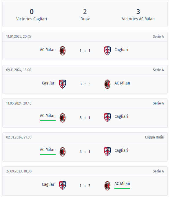 AC Milan have clearly had the upper hand in the last five meetings, with three wins and two draws. From 2023 to early 2024, they recorded three consecutive wins, each by at least two goals, including a 4-1 victory in the 2024 Coppa Italia round of 16 that ended Cagliari’s participation in the cup. This streak then turned into a 3-3 draw in 2024, followed by a 1-1 draw in January 2025. These encounters were remarkably open, with the overall score over the five games standing at 16-7 in favor of AC Milan, which means an average of more than four goals per game. Every encounter exceeded the two-goal mark, and between 2023 and 2024 there were four consecutive games with at least four goals, with both sides scoring in all five games, meaning there were no clean sheets. In terms of the flow of the game, AC Milan usually takes control early on, leading at halftime in most of these duels, while Cagliari has never gone into the break with a lead and has often had to chase the game. The second halves tend to be even more open, with both teams scoring regularly and Cagliari conceding goals after the break in each of the five encounters. The venue played a role to a certain extent, as all three of AC Milan’s wins came at home, while Cagliari’s best results were a 3-3 draw in front of their home crowd in 2024 and a 1-1 draw at AC Milan in January 2025. Pisacane’s team may have gradually adapted to this opponent, as the gap between clear defeats and two competitive, evenly matched duels has narrowed.
