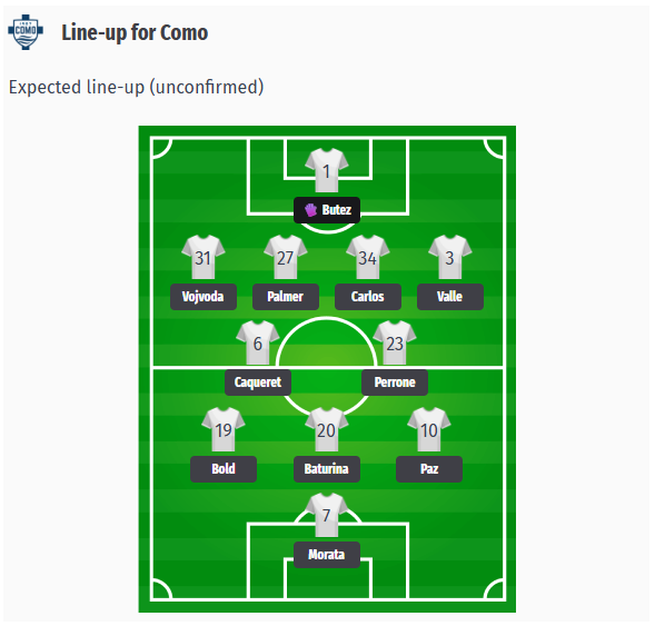 Como are expected to line up in their usual 4-2-3-1 formation, but with a few absences and limitations. Coach Cesc Fàbregas will be missing from the bench after his appeal was rejected. Assane Diao is still out with a persistent foot injury, and Jayden Addai is also unavailable due to a thigh injury. Álvaro Morata will therefore be the only real striker. In central defense, Alberto Dossena is likely to be out for the long term. Possible central defenders are Diego Carlos and Posch, while Vojvoda and Valle are likely to take over the full-back positions. Ignace Van der Brempt and Sergi Roberto are also out with injuries. The attacking midfield will consist of Kühn, Baturina, and Paz, who will provide support for Morata in front of goal. Como is relying on a mix of experienced players and young talents, who have only been convincing in phases so far.