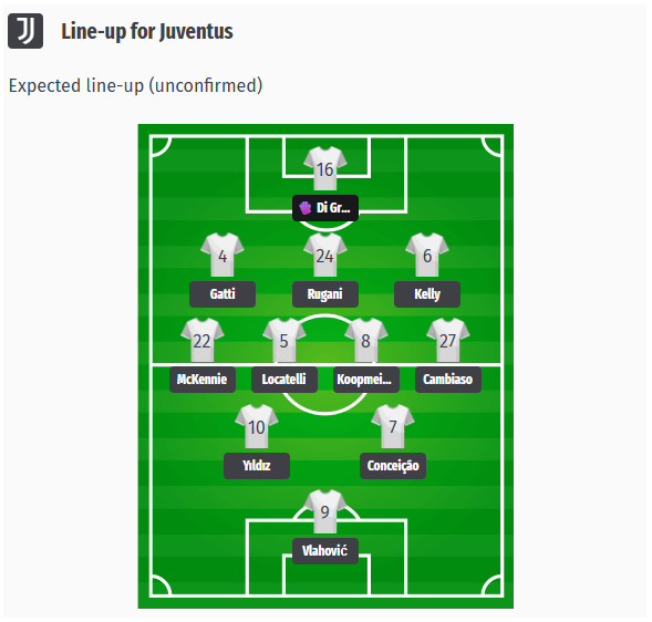 Coach Igor Tudor is expected to field his usual 3-4-2-1 formation. Gatti, Rugani, and Kelly are likely to play in the back three, with Bremer still out for at least two months after meniscus surgery in Lyon. In midfield, Locatelli and Koopmeiners are expected to play in the center, flanked by McKennie and Cambiaso on the wings. Dusan Vlahović is likely to start as the lone striker, with the strong duo of Yıldız and Conceição playing behind him in the number 10 role. Tudor has some notable alternatives on the bench in David, Openda, and Zhegrova, who he can bring on for tactical changes or to provide fresh impetus.