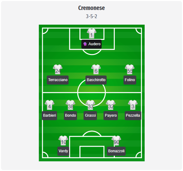 Cremonese are expected to stick with a 3-5-2 formation, with Nicola likely to put his faith in this basic setup once again, which is why our predicted line-up has Audero in goal, backed up by a back three of Terracciano, Baschirotto and Folino. With Ceccherini suspended after his red card in Rome, Folino should retain his place, while Pezzella and Barbieri are expected to start as more conservative wing-backs. In midfield, we see Bondo and Grassi in front of the defense, with Payero returning from suspension in a more free-roaming role between the lines. Collocolo remains sidelined with a thigh injury, which reduces the depth in the center somewhat. Vardy and Bonazzoli are likely to start up front, while Sanabria, Okereke, and De Luca remain the most obvious alternatives for fresh impetus in attack.
