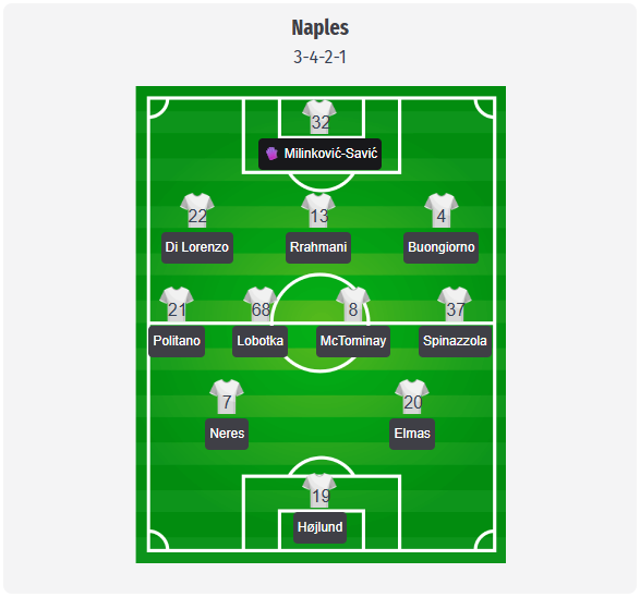 Napoli are likely to stick with the 3-4-2-1 formation outlined above, with Milinković Savić in goal behind a back three of Di Lorenzo, Rrahmani, and Buongiorno. Politano and Spinazzola will once again provide width, while Lobotka and McTominay will provide cover in the center. In front of them, Neres and Elmas are expected to operate between the lines, behind Højlund as the lone striker. With Gilmour, Anguissa, and De Bruyne still out, the alternatives in midfield are relatively limited, making Elmas even more important as the link to the attacking players. According to recent reports, Napoli are also waiting for Lukaku to return from injury, so he remains on the bench in our projection as a possible weapon, while Neres, fresh from his brace in the Supercoppa, has a very good chance of starting again.