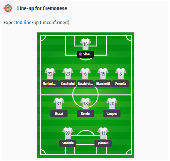 Coach Davide Nicola is expected to opt for a 5-3-2 formation. Silvestri will be in goal, with Floriani Mussolini, Ceccherini, Baschirotto, Bianchetti, and Pezzella forming the back five. Grassi, Bondo, and Vázquez will provide stability and creativity in midfield, with Sanabria and Johnsen leading the line. Terracciano is still out with muscle problems, Moumbagna is also unavailable, and Collocolo is struggling with a thigh injury and is not expected back until the end of December at the earliest. Among others, experienced forwards Vardy and De Luca are available as substitutes should Nicola need to make adjustments during the game.