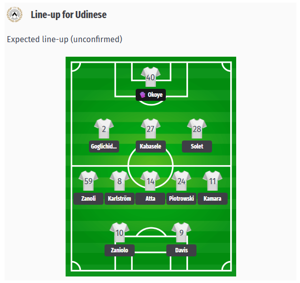 Coach Kosta Runjaić is likely to make some slight changes to the defense in the expected 3-5-2 formation: Kristensen is expected to be out for about a month with a hamstring injury, so Kabasele will move into the back three alongside Solet and Goglichidze, with Bertola as backup. Okoye returns in goal after serving his suspension. Zanoli and Kamara are set to start on the wings, while Karlström, Atta, and Piotrowski could make up the central midfield. Zaniolo is expected to play as a deep-lying striker and Davis as a center forward, after Runjaić recently signaled his confidence in the returning loan player. Alternatively, Lovrić or Ekkelenkamp could also be options.