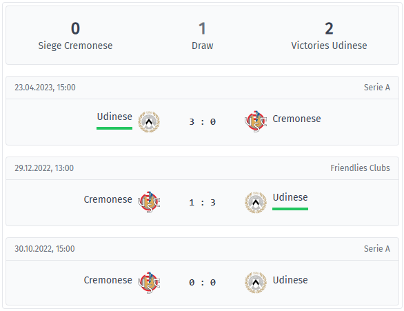 Udinese has clearly dominated the last three encounters: two wins and a goalless draw in 2022. Cremonese did not emerge victorious in any of these games. Udinese’s superiority in the first half is striking, with all goals in these three games coming before the break and the second half remaining goalless. The most convincing victory was the 3-0 win at home in April 2023, when Udinese went into the break 2-0 up and gave Cremonese no real chance of a comeback. A similar pattern was seen in the friendly at the end of 2022, which ended 3-1, with Udinese setting the course for victory early on.
