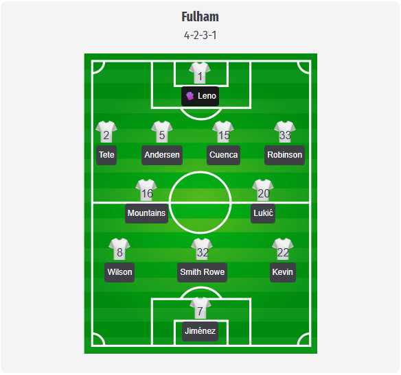 Fulham are expected to stick with their familiar 4-2-3-1 formation, with Leno in goal behind a back four of Tete, Andersen, Cuenca, and Robinson. Berge and Lukić are likely to anchor the midfield again and provide a reliable base for quick transitions. Ahead of them, Wilson is expected to start on the right, Smith Rowe as the central playmaker, Kevin on the left, and Jiménez as the lone striker. This is a predicted lineup and not a confirmed team announcement, with injuries significantly affecting the options. With Bassey, Iwobi, and Chukwueze still at the AFCON and Muniz and Sessegnon out injured, Marco Silva has fewer options in defense, on the wings, and in attack. This could mean that Reed, Cairney, or Traoré will mainly come off the bench, maintaining the core structure that has driven Fulham’s recent resurgence in the league.