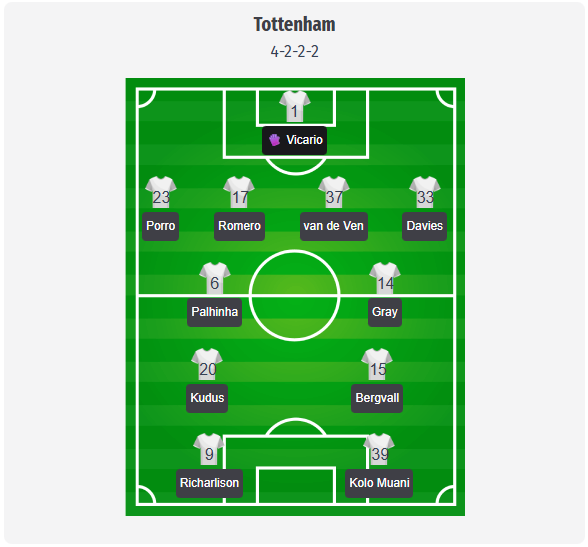Tottenham are expected to line up once again in Thomas Frank’s familiar 4-2-2-2 formation, with my predicted starting XI including Vicario in goal, Porro and Davies at full-back, and van de Ven plus a replacement for the suspended Romero in central defense, most likely Danso. Palhinha and Gray should anchor the midfield, with Kudus and Bergvall operating between the lines behind the strike duo of Richarlison and Kolo Muani. Interestingly, key absences shape this prediction, as Xavi Simons is suspended and Maddison, Kulusevski, Udogie, and Solanke remain sidelined, meaning the creative burden could fall heavily on Kudus and Bergvall, whom Frank trusts as number 10s. Bissouma and Pape Sarr are away at the AFCON, so control in the center is likely to depend heavily on Palhinha’s cover and Gray’s running ability. This remains a predicted lineup and not a confirmed team announcement.