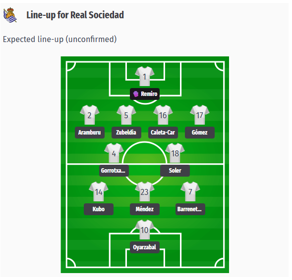 Coach Sergio Francisco is likely to revert to the tried-and-tested 4-2-3-1 system that was successful against Athletic. Yangel Herrera is still out with a calf injury, and his return is uncertain. Orri Óskarsson is expected to be out until the end of the year with thigh problems. The expected lineup in a 4-2-3-1 formation: Remiro in goal, Aramburu, Zubeldia, Caleta-Car, and Gómez in defense. Gorrotxategi and Soler will play in defensive midfield. Kubo, Méndez, and Barrenetxea will play in attacking midfield behind captain Oyarzabal, who will play as a striker. Gorrotxategi could once again be the match winner after scoring a late goal against Athletic.