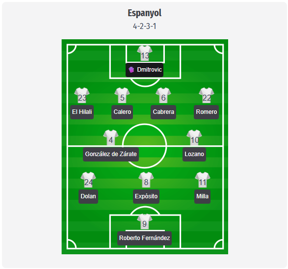 Espanyol are expected to stick with Manolo González’s usual 4-2-3-1, with our predicted lineup seeing Dmitrovic in goal behind a back four of El Hilali, Calero, Cabrera, and Romero. González de Zárate and Lozano would form the double pivot, Dolan and Milla would start on the wings, and Expósito would operate as the central playmaker behind Fernández, a stable structure that has given the team balance in recent league games. This remains a possible lineup rather than a confirmed one, as Pickel is away with his national team and Terrats is out with a thigh injury, so any further issues could change the midfield structure. Puado, Koleosho, Carreras, or García offer different profiles in attack, and it could be that González changes one of the three attacking midfield positions shortly before kickoff.