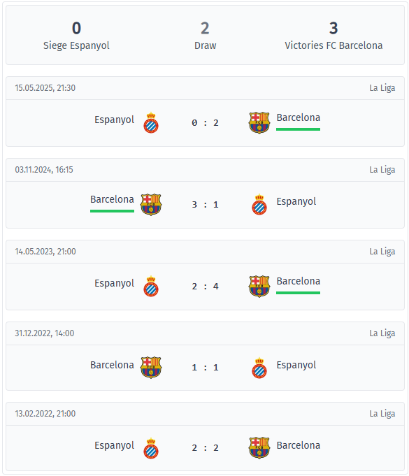 Barcelona have clearly had the upper hand in the last five league matches between 2022 and May 2025, remaining unbeaten with three wins and two draws, and are currently on a three-game winning streak. Espanyol have not won a single game in this sequence, so the recent results clearly favor Barcelona. Each of these five games ended with at least two goals, four of them with goals at both ends. Barcelona scored in all five games, while Espanyol were successful in four games. The only goalless game from Espanyol’s perspective was the 2-0 home defeat in May 2025. This gives Barcelona a perfect scoring rate of 100% and Espanyol 80%. Home advantage has not shifted the balance, with Espanyol losing their last two encounters at the RCDE Stadium, 4-2 in 2023 and 2-0 in May 2025, giving Barcelona an overall record of 6-2. There was a draw at Barcelona’s stadium in 2022, followed by a 3-1 home win in 2024, meaning Espanyol struggled at both venues. The pattern within the games is also clear, with Barcelona scoring in the first half in four of the five encounters and never going into the break behind. Espanyol conceded before halftime in four of the five games and were never in the lead at the break. Interestingly, Espanyol scored in four games after the break, so they tend to react late rather than dictating the game early on.