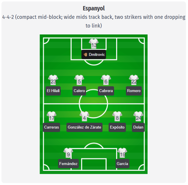 González is likely to stick with a 4-4-2 formation and organize Espanyol in a compact midfield block, with El Hilali and Romero playing cautiously to allow the wingers to make their runs. Dmitrovic should start behind Calero and Cabrera, a duo chosen primarily for their aerial control. Up front, Fernández looks more like the one who drops into the spaces to link up play, while García is expected to attack the depth. The big problem is Puado, who is out long term, which takes away a natural outlet on the left and an important tempo setter in pressing. Dolan and Carreras are therefore expected to carry most of the transition threat on the wings, while Urko González de Zárate and Expósito provide balance in the center. If González wants more control at the back, Lozano or Terrats could come off the bench.
