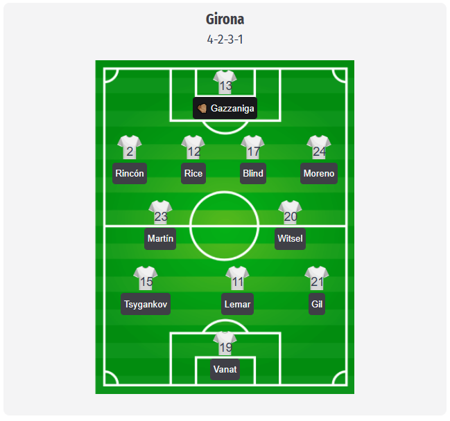 Míchel is likely to stick to Girona’s usual 4-2-3-1 formation, with Gazzaniga expected to start in goal. In this prediction, the back four would consist of Rincón and Moreno on the flanks, with Reis alongside Blind in the center. The idea is familiar: build patiently from the back, draw pressure, and then find the passing options on the wings early on. In midfield, Martín and Witsel could form the double six, giving Lemar the freedom to pull the strings between the lines, while Tsygankov and Gil provide width around Vanat up front. Girona will likely have to do without Ounahi due to international duty, while van de Beek and Portu are out with long-term injuries and Abel Ruiz is also sidelined, so Stuani seems the obvious alternative if they need another target man.