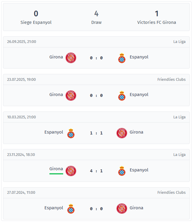 Girona are unbeaten in their last five meetings, with one win and four draws, while Espanyol have now gone five games without a win. The most striking pattern is how often the game ends in a draw, with 80% of these matches ending in a tie. Even when Girona has looked the stronger side at times, the scoreboard has mostly refused to separate the two. Last year, the series was almost sterile, with no goals in September 2025, again no goals in July 2025, then a 1-1 draw in March 2025. Three consecutive head-to-head matches in which neither team scored more than once suggest that this duel stifles both sides’ rhythm and chances. It is also interesting to note that the first halves repeatedly ended in a draw, so early risk-taking was rather rare. The outlier is 2024, when Girona won 4-1 in the league, the only clear result in this sample of five games. Apart from that, the other match in 2024 ended goalless, and overall, four of the five games had fewer than 2.5 goals. If this trend continues, it will again depend more on patience and a single mistake than on sustained pressure.